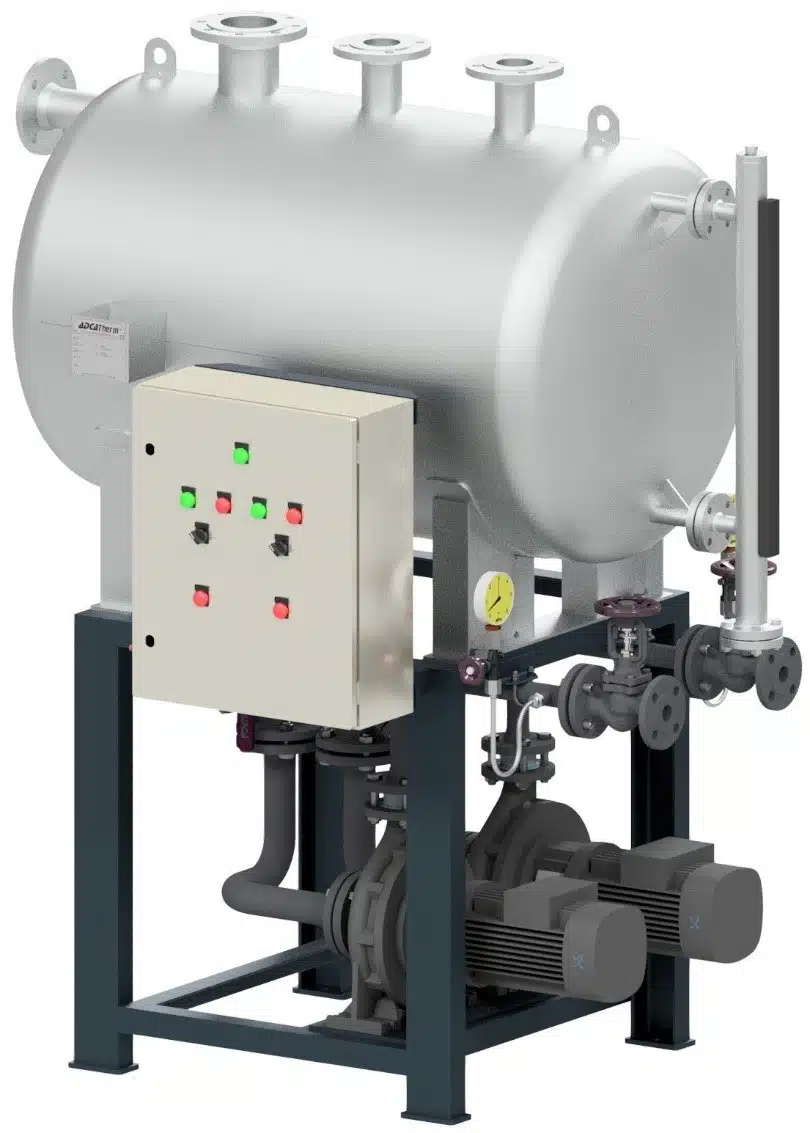 Het condensaat wordt van boven in het vat gevoerd en het controlesysteem start het pompproces op een vooraf bepaald niveau. Het condensaatvat is beschikbaar in roestvrij- of koolstofstaal en er zijn meerdere opties voor verschillende componenten waardoor de ECRU gegarandeerd voldoet aan de behoeften van uw stoomsysteem.